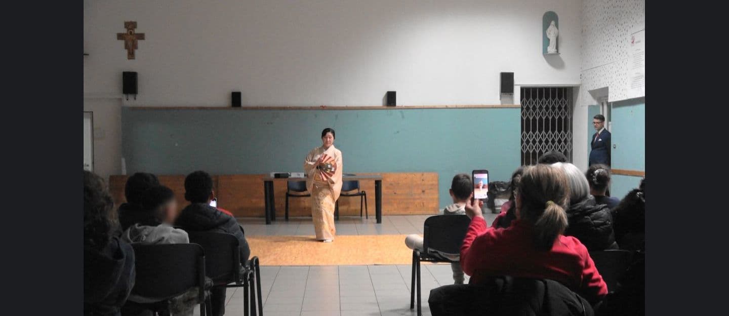 ポントレモリの4つ高校のクラスの生徒たちに集まってもらいました。二名の高校生に登壇して頂き、質疑応答の通訳をお願いしました。生徒達に関わってもらったことで、より身近に感じて貰えたような気がします。下駄体験では好奇心旺盛な生徒が登壇してくれたので、より印象に残ったのではないかと思います。
